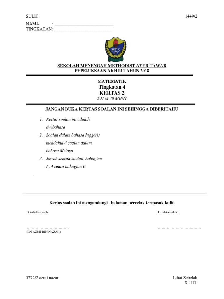 . Berikut adalah koleksi kertas soalan percubaan trial papers berserta skema jawapan bagi peperiksaan Sijil Pelajaran Malaysia SPM bagi semua subjek utama dari semua negeri bagi tahun 2018 2019 dan 2020. Latih Tubi Matematik SPM 2018 Kedah Modul Soalan Matematik Mathematics Skema Jawapan untuk SPM Program Bimbingan Peperiksaan. MRSM Negeri Sembilan.